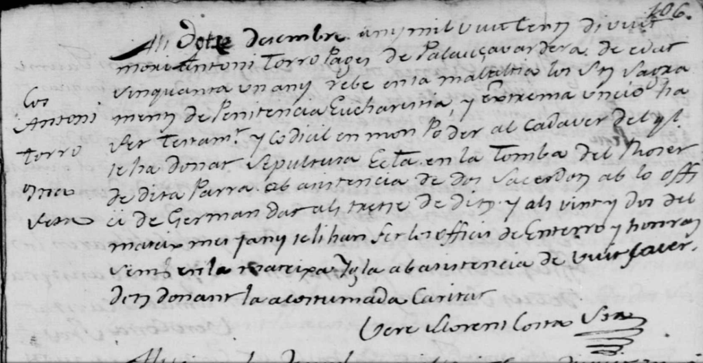 Il demande à être enterré dans le cimetière paroissiale de l’Église San Juan Baptista de Palau-Saverdera et requiert une messe en sa mémoire pour son enterrement et le salut de son âme selon le rite traditionnel. Il désire être enterré le jour même de sa mort.