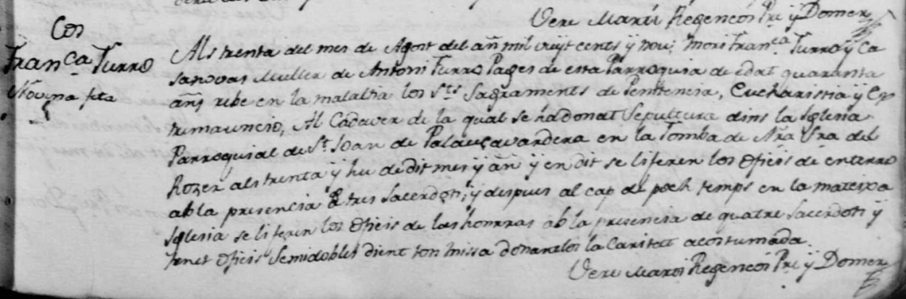 Mes recherches généalogiques dans ce village m’ont permi d’exhumer trois cas. A neuf ans d’intervalle, Franscisca Casanovas (1769-1809) et Antoni Turro (1767-1818), mari et femme, vont succomber à la maladie. Dans ce pays catholique très pratiquant, ils reçoivent l’extrème-onction avant de mourir. Antoni Turro, au seuil de la mort, la recevra le 12 décembre 1818 et deux prêtres le veilleront durant son agonie jusqu’à son décès, dix jours plus tard, le 22 décembre 1818. En 1820, c’est également le cas de Rafel Himonench (1748-1820).