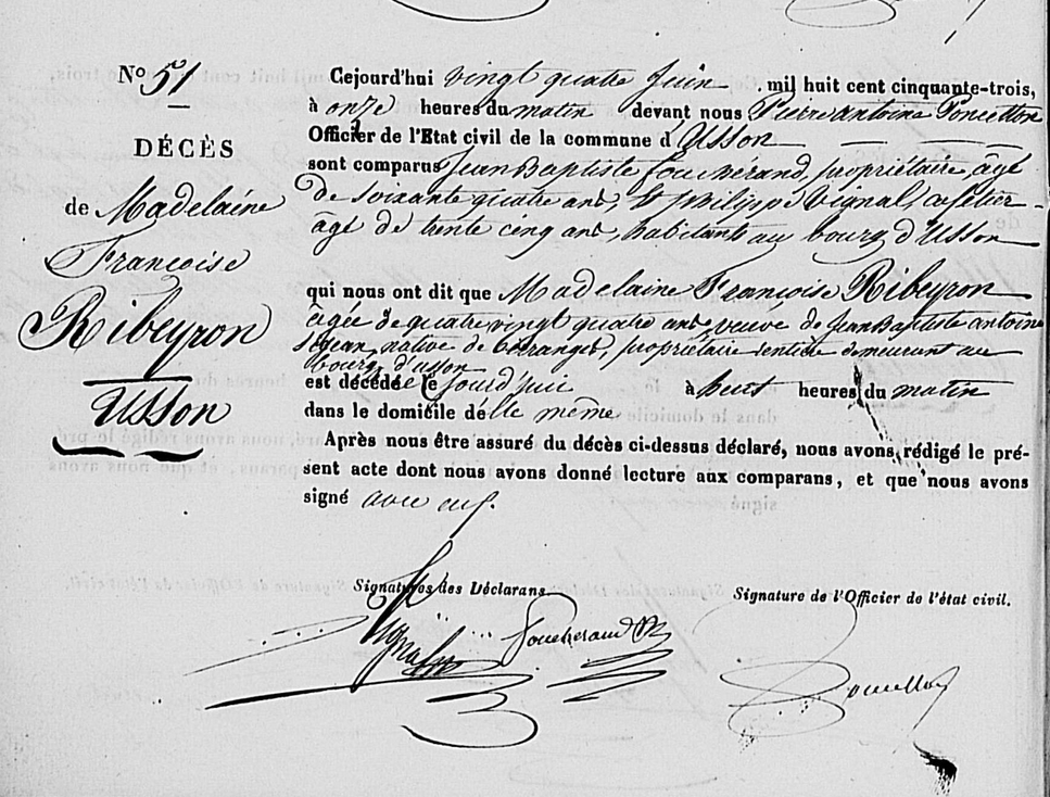 A Usson-en-Forez, dans la Loire, le 31 juillet 1790, naquit Louise Élisabeth Sigean. Fille de deux bourgeois de cette petite bourgade peuplée d’environ 3.000 habitants, elle est présentée à l’officier civil par son grand-père maternel, Louis Ribeyron de Voirac, administrateur du département de la Haute-Loire. Pourquoi son père est-il absent ?