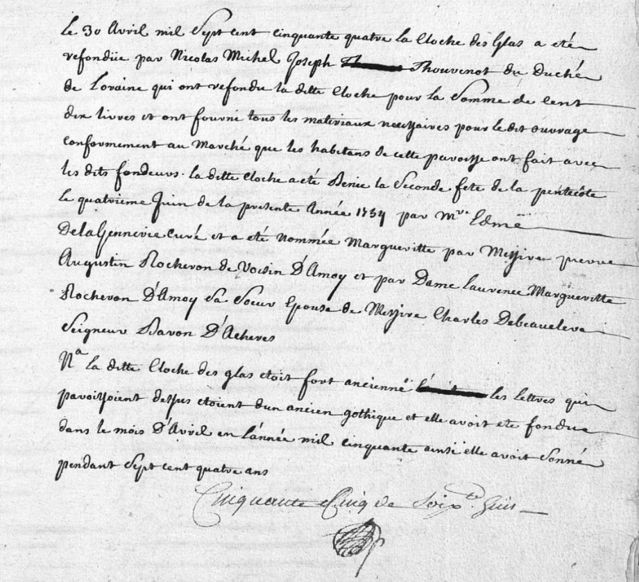 Notons que si la cloche prend le nom de la Dame d’Aschères, ce sont les habitants de la paroisse qui ont payés la cloche d’après ce que stipule le curé. On ne sait pas à quelle hauteur à participer la famille d’aristocrate ou même si c’est le cas…