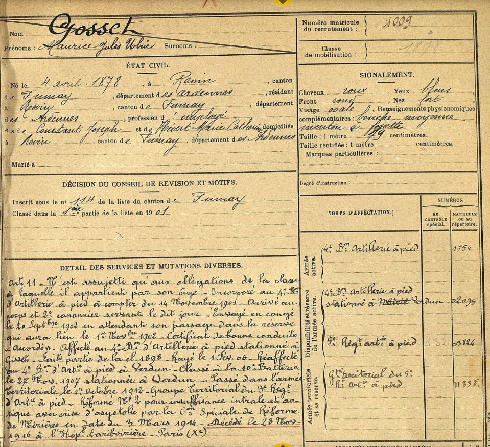 Le 4 avril 1878 y naquit Maurice Jules Ulrich Gosset. Ses parents, Constant Joseph et Marie Catherine Zoé Hévert ne s’en doutaient pas encore mais leur fils deviendrait précocement une gloire locale.