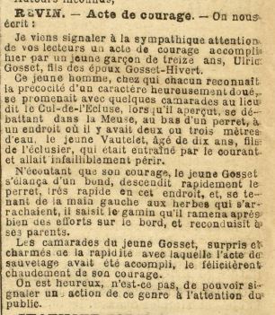C’est à l’âge de 13 ans seulement que, n’écoutant que son courage, le jeune Ulrich allait sauver le fils de l’éclusier de la noyade. Le Petit Ardennais du 30 juin 1891 relate :