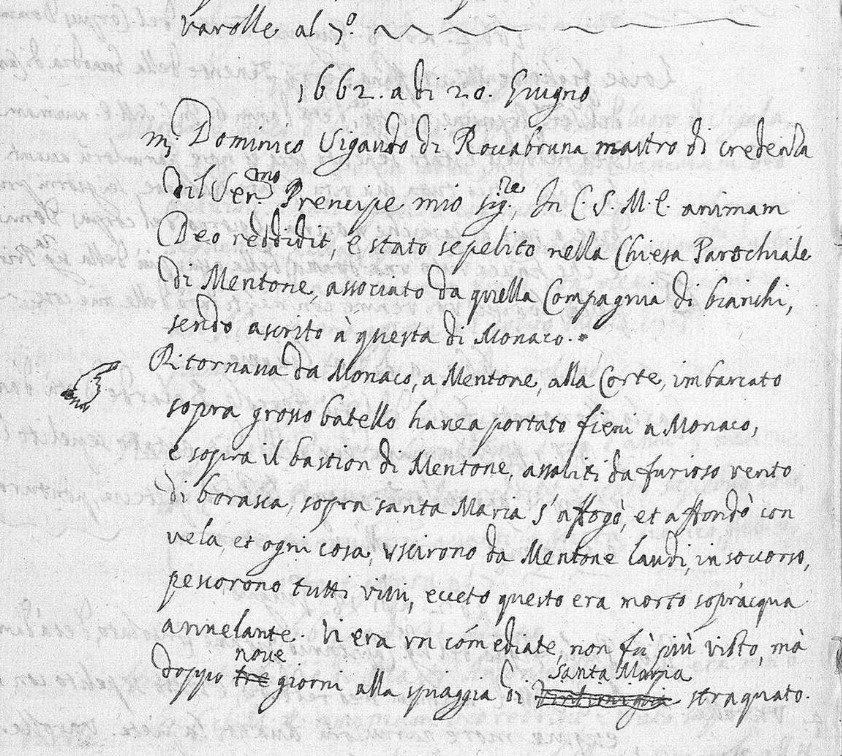 Le 20 juin 1662, alors qu’il effectue, par voie maritime, le trajet de Monaco à Menton, il est piégé par une tempête. Dans la panique, il est assommé par une voile et, sous le choc, tombe à l’eau.
