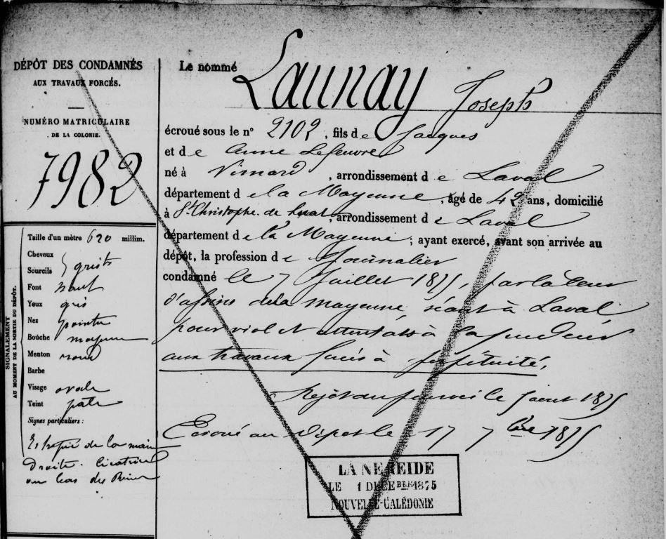 Le 01/12/1875, il embarque à bord du navire La Néréide pour la Nouvelle-Calédonie, sous le matricule 7982.