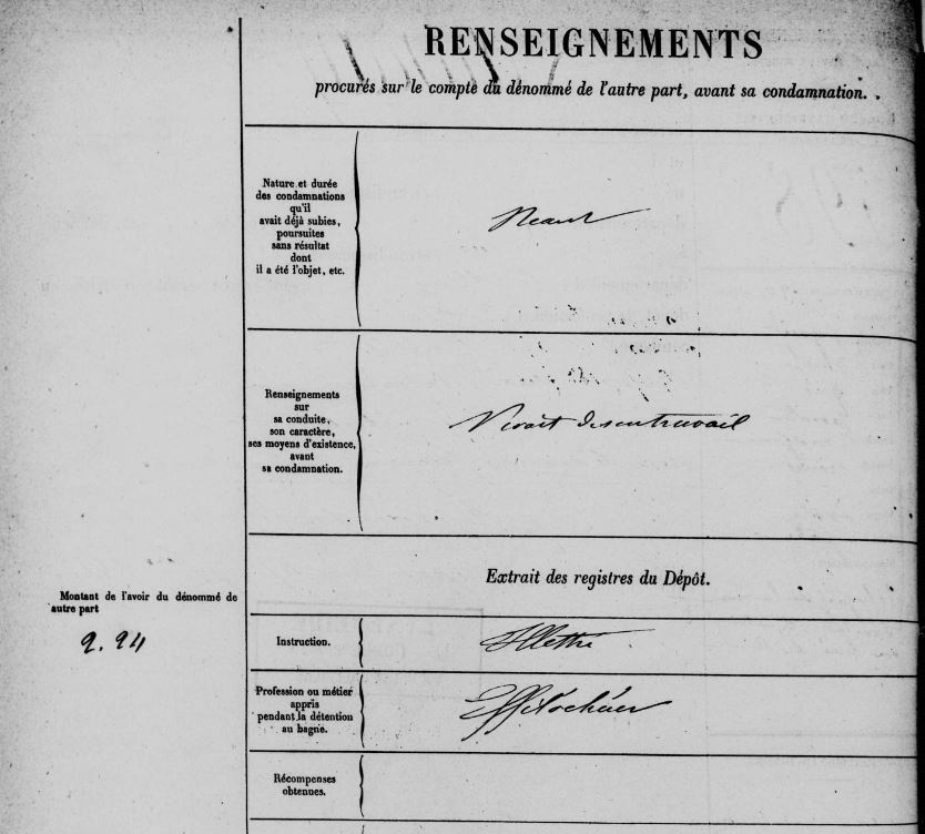 Monsieur Marchi, directeur du bagne de Bourail (Nouvelle-Calédonie), indique qu’avant sa condamnation, il vivait de son travail de journalier et possédait un casier vierge. Il note également qu’il est illettré et qu’il a appris le métier d’effilocheur au bagne. Ce dernier consiste à découdre de vieux chiffons pour en faire du papier.