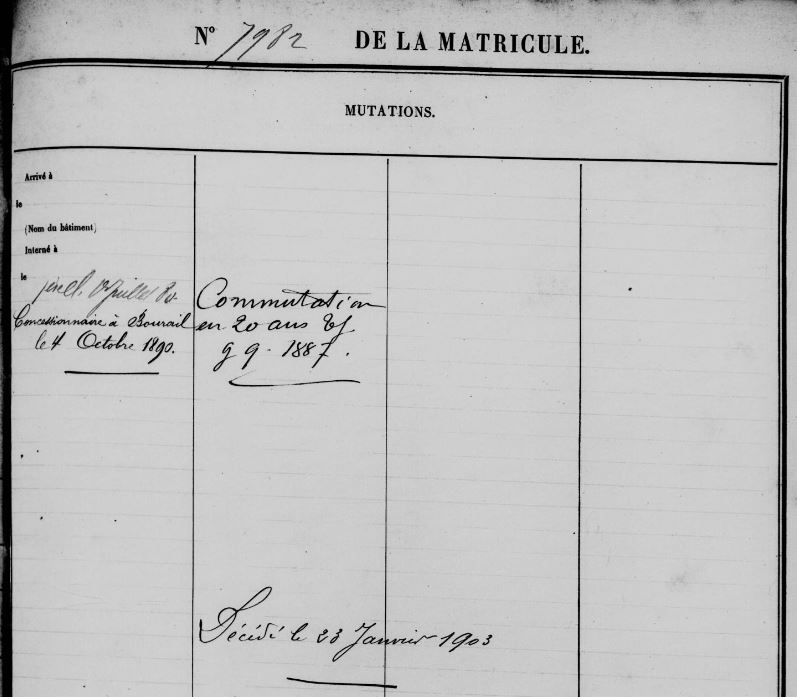 Le 09/09/1887, sa peine à perpétuité est commuée en une peine de 20 ans.